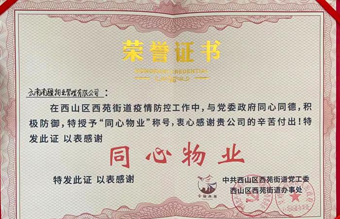 近日,公司南疆物業(yè)收到昆明市西山區(qū)西苑街道辦事處寄來的感謝信。西苑街道辦事處對南疆物業(yè)公司積極響應(yīng)號召、義無反顧參加社區(qū)疫情防控工作致以崇高的敬意和衷心的感謝,并授予“同心物業(yè)”稱號。
